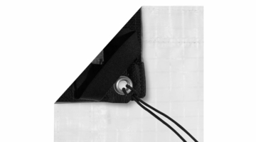 Size: 6 ft x 6 ft Black/white poly bounce, also known as Griffolyn, features a shiny white surface (bounce) on one side and a black surface (opaque) on the opposite side. Poly bounce is a non-flame retardant (NFR) fabric. Its plastic-like composition makes this fabric extremely durable and optimal for use outdoors. All of Modern's fabrics come with webbing, grommets, and ties along all sides. We also sew elastic on all four corners which allow for a quick connection onto one of our frames. Each textile comes with a storage bag, labeled with its contents.