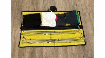 The 4x4 Flag Kits include frames made of 3/8 inch Stainless Steel tubing with Stainless Steel connector pins. An elastic cord keep all the pieces together even when collapsed. Bag contains a Stainless Steel tube sewn into the bottom to keep the bag rigid and allows the bag to be hung from the "T" handle on a stand. The bag is made of 1000 Denier Cordex black textured nylon, with a yellow polyester interior. Eight pockets (5 small, 3 medium) are provide to store Covers. A zipper securely keeps everything safe. Any 4x4 SLIPPER can be used on these frames.